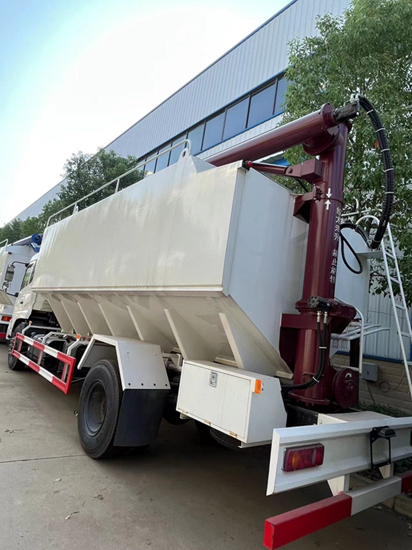 散裝飼料運輸車,散裝飼料車的飼料罐架設在卡車的底盤上,罐頂開有進料口.頂部的一根螺旋輸送卸料管(俗稱卸料絞龍)則可自由回轉和抬升,抬升的仰角可達60度。運輸時,頂部的螺旋管平臥在罐頂;卸料時則抬起,使管端的出料口與畜禽飼養(yǎng)場貯料罐頂部的進料門相接,駕駛室內裝有操縱裝置(操縱裝置也可裝置在罐體尾部),卸料時通過車底的動力輸出軸和減速器來驅動螺旋,以完成卸料。