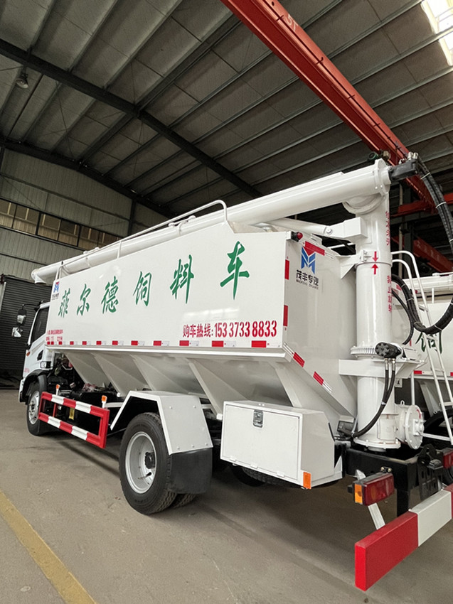 散裝飼料運(yùn)輸車(chē),散裝飼料車(chē)的飼料罐架設(shè)在卡車(chē)的底盤(pán)上,罐頂開(kāi)有進(jìn)料口.頂部的一根螺旋輸送卸料管(俗稱(chēng)卸料絞龍)則可自由回轉(zhuǎn)和抬升,抬升的仰角可達(dá)60度。運(yùn)輸時(shí),頂部的螺旋管平臥在罐頂;卸料時(shí)則抬起,使管端的出料口與畜禽飼養(yǎng)場(chǎng)貯料罐頂部的進(jìn)料門(mén)相接,駕駛室內(nèi)裝有操縱裝置(操縱裝置也可裝置在罐體尾部),卸料時(shí)通過(guò)車(chē)底的動(dòng)力輸出軸和減速器來(lái)驅(qū)動(dòng)螺旋,以完成卸料。