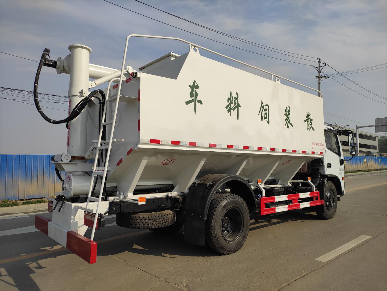 散裝飼料運(yùn)輸車(chē),散裝飼料車(chē)的飼料罐架設(shè)在卡車(chē)的底盤(pán)上,罐頂開(kāi)有進(jìn)料口.頂部的一根螺旋輸送卸料管(俗稱(chēng)卸料絞龍)則可自由回轉(zhuǎn)和抬升,抬升的仰角可達(dá)60度。運(yùn)輸時(shí),頂部的螺旋管平臥在罐頂;卸料時(shí)則抬起,使管端的出料口與畜禽飼養(yǎng)場(chǎng)貯料罐頂部的進(jìn)料門(mén)相接,駕駛室內(nèi)裝有操縱裝置(操縱裝置也可裝置在罐體尾部),卸料時(shí)通過(guò)車(chē)底的動(dòng)力輸出軸和減速器來(lái)驅(qū)動(dòng)螺旋,以完成卸料。